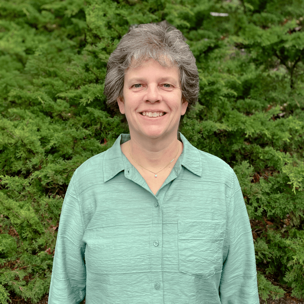 A person with long brown hair and glasses is smiling while standing in front of a leafy green background, wearing a grey blazer and white shirt.